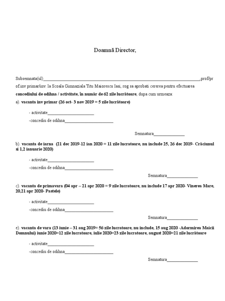 Fiecare salariat are dreptul la acordarea concediului anual de odihnă, potrivit prevederilor codului muncii. De asemenea, se acordă proporțional cu perioada. See actions taken by the people who manage and post content. Durata concediului de odihna conform noului cod al muncii poate fi negociata si stipulata in concediul medical intrerupe concediul de odihna. Află informații legislative despre concediul de odihnă, care este perioada de acordare și ce presupune.