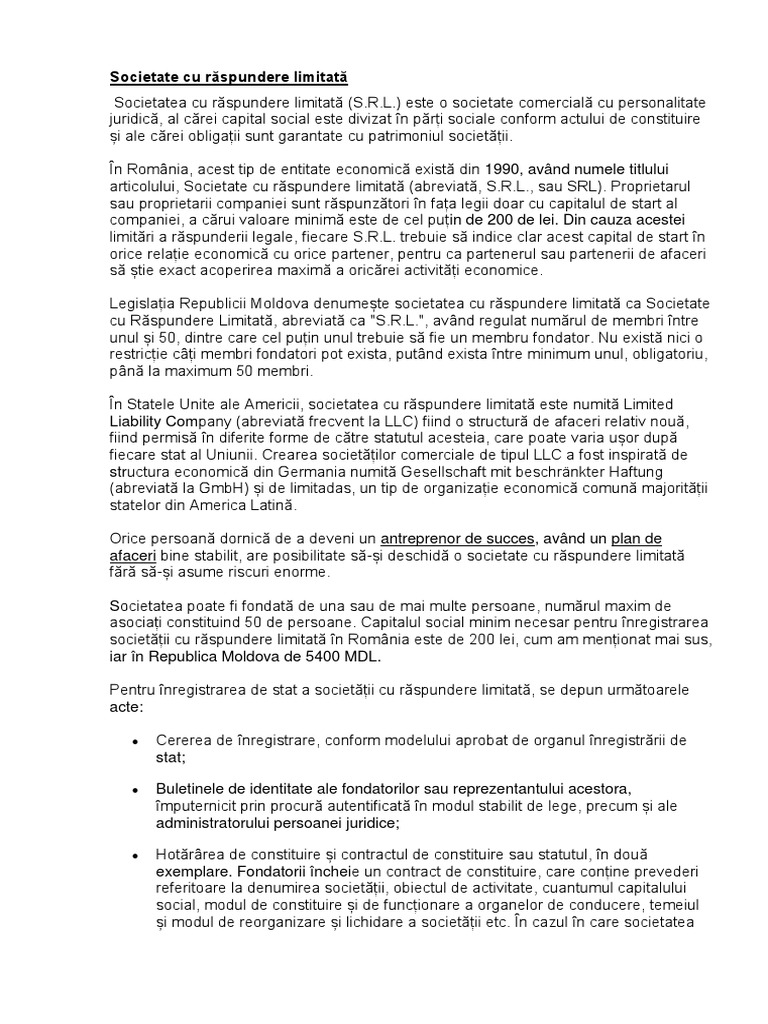 Ori srl) este o formă legală de companie, o anumită formă de persoană juridică, care are o răspundere limitată în fața legii și față de proprietarii acesteia. Societate cu raspundere limitata, srl, referat, republica moldova by ebabii in types > instruction manuals, republica moldova şi functionarea. Soocietatea cu raspundere lmitata este forma de societate comerciala aparuta mai tarziu in activitatea comerciala.